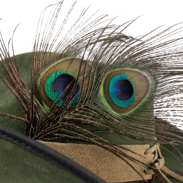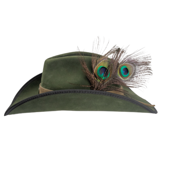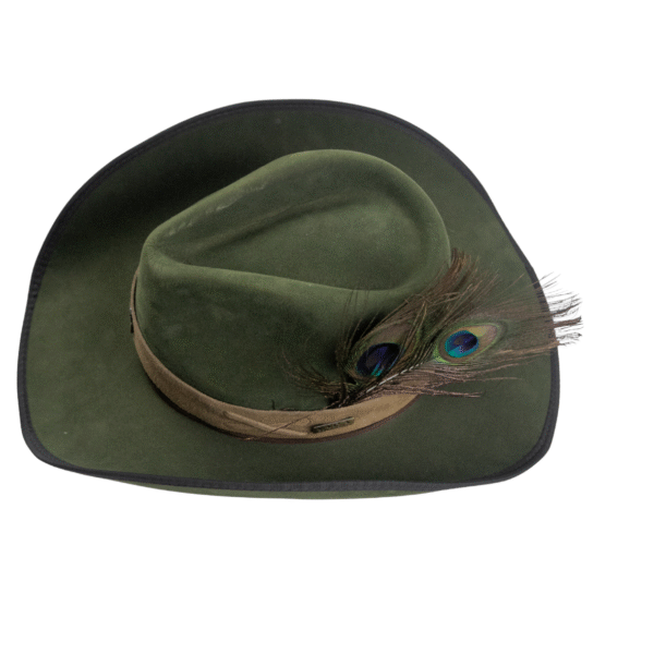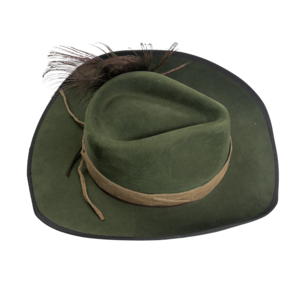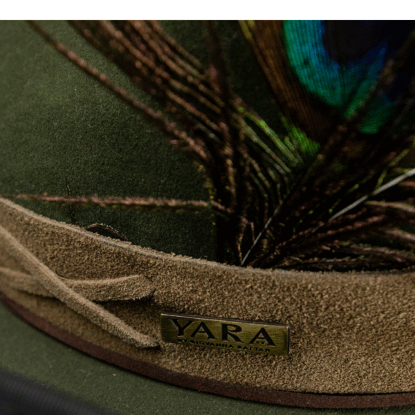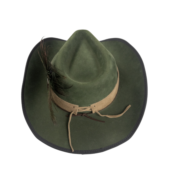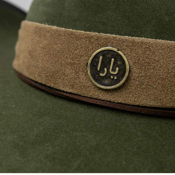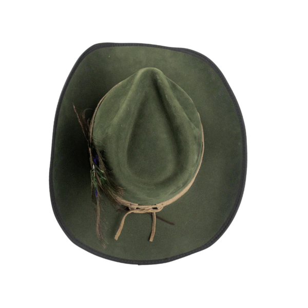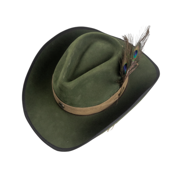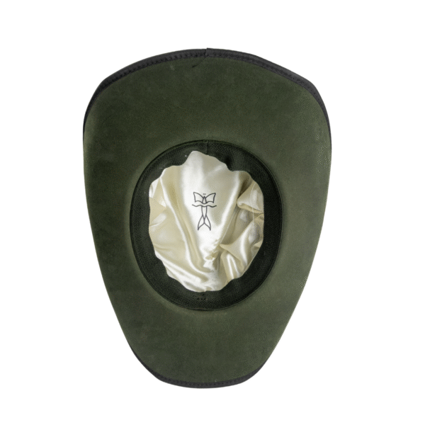 • Chapéu fedora em suede verde musgo, com aba curvada e estrutura maleável.